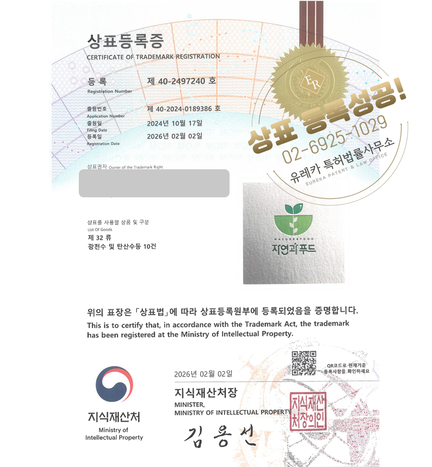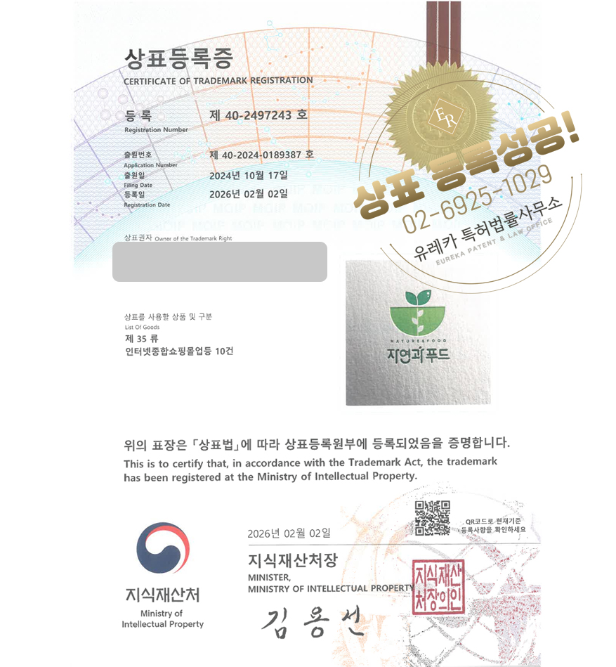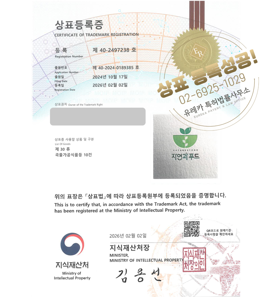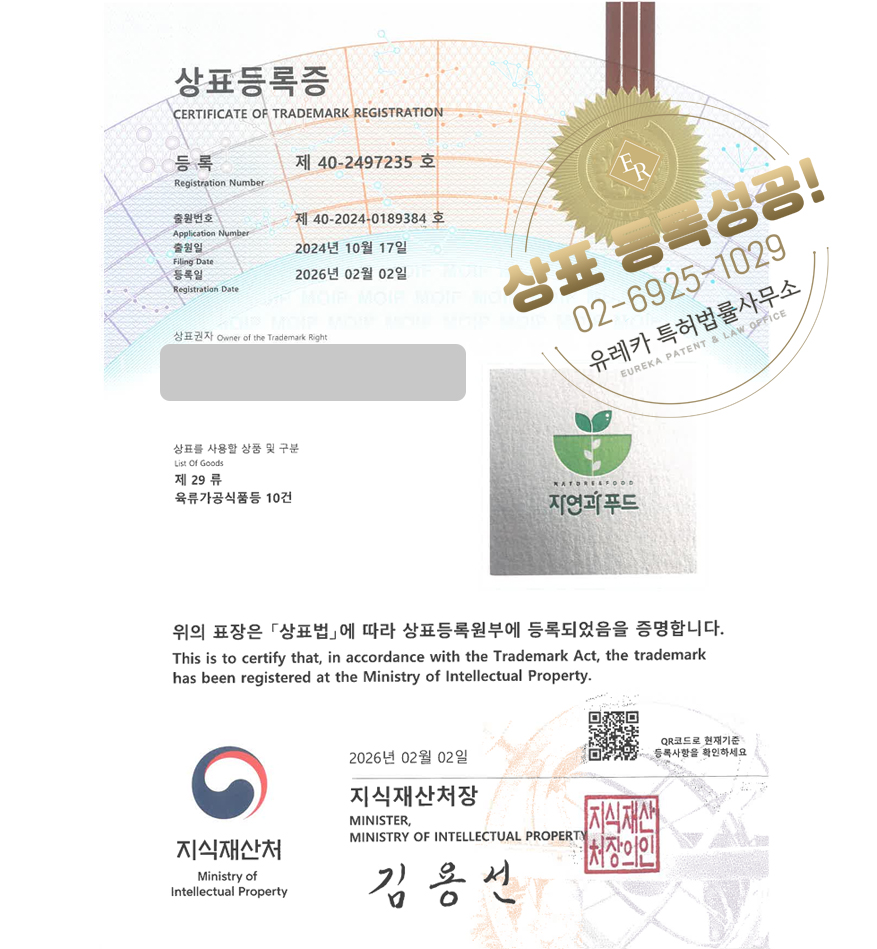 상표심사를 통과하여, 최종적으로 29, 30, 32, 35류 상표등록에 성공하였습니다!