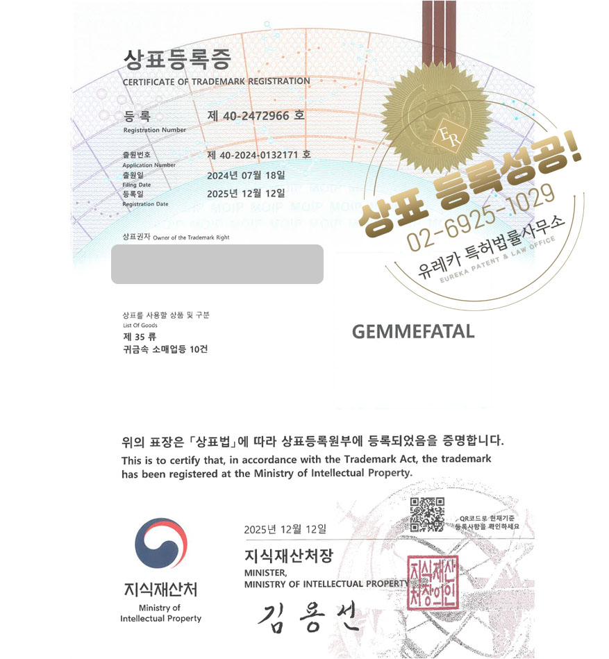 유레카 상표등록성공! 장신구브랜드, 주얼리제조사, 보석공방 상표 특허 출원 “GEMMEFATAL” 상표권 디자인 등록