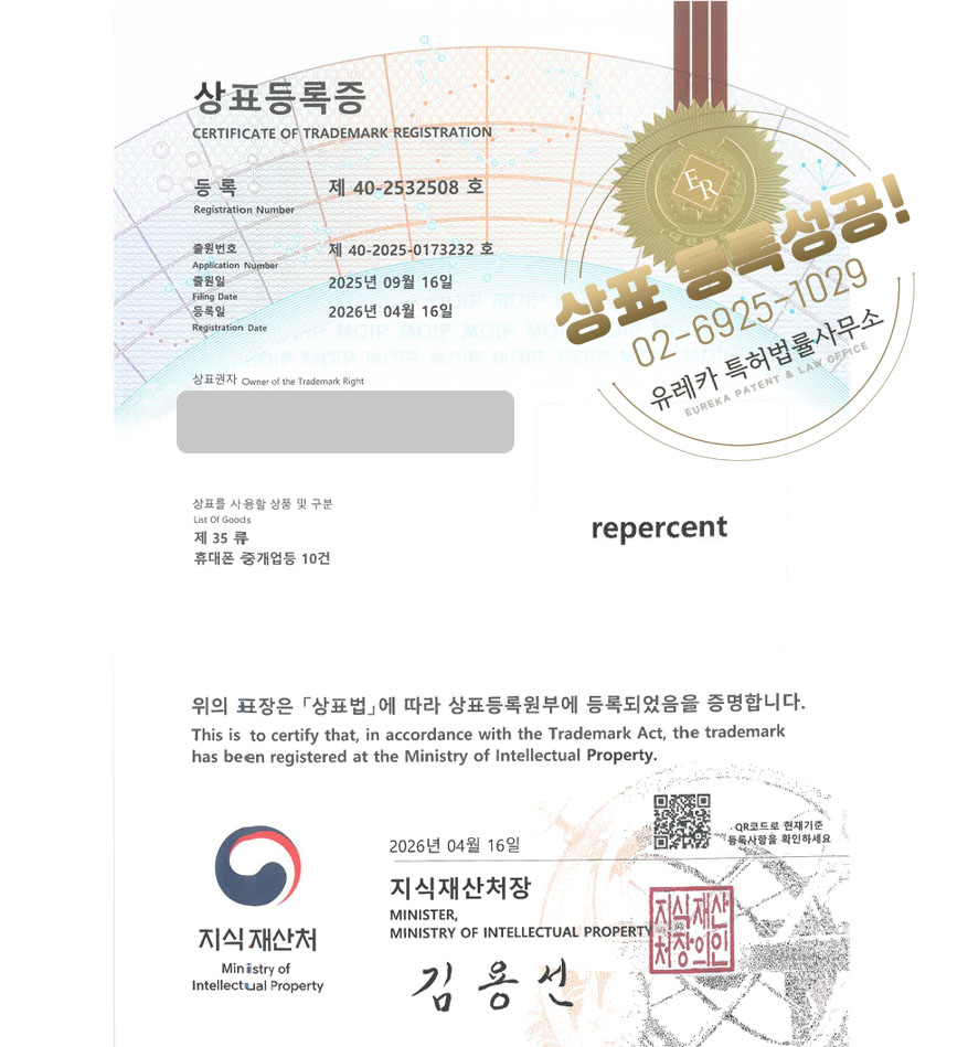 유레카 상표등록성공! 중고거래 앱, 리커머스, 중고폰 거래 플랫폼, 모바일 액세서리, 휴대폰중개몰 상표 특허 출원 “리퍼센트” 상표권 디자인 등록