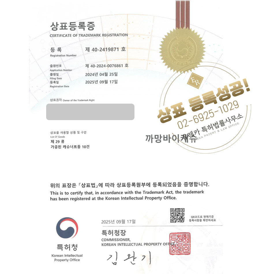 유레카 상표등록성공! 치즈 브랜드, 유제품, 견과 브랜드 상표 특허 출원 “까망바이캐슈” 상표권 디자인 등록