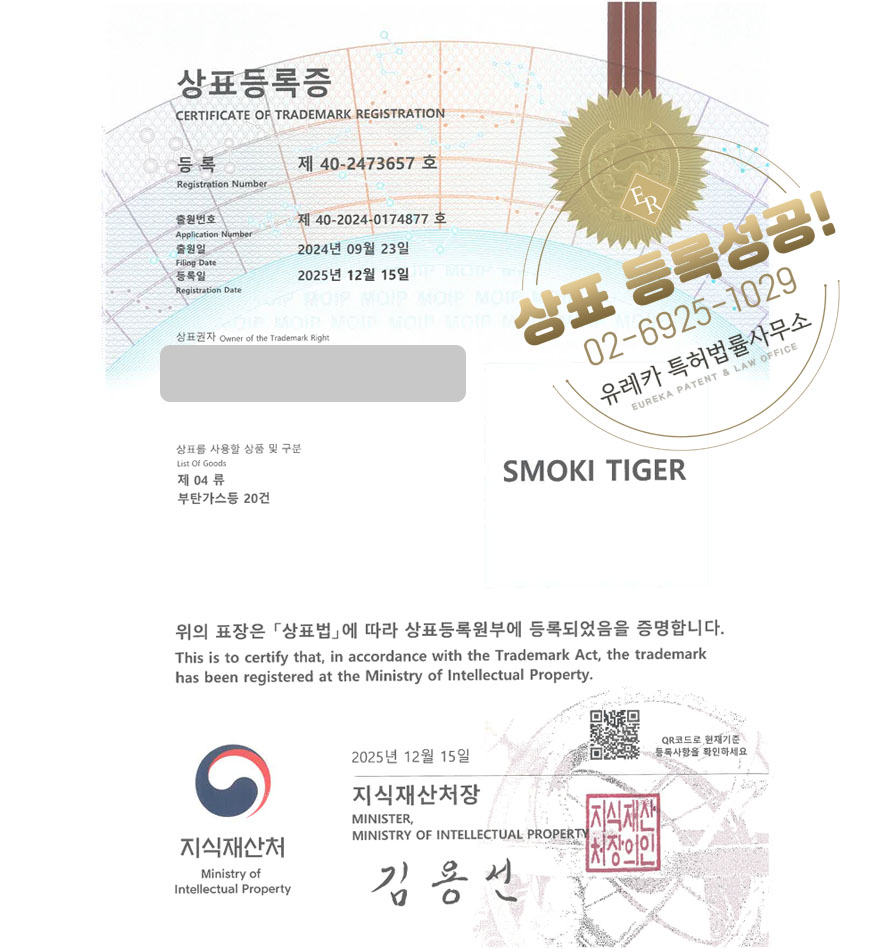 유레카 상표등록성공! 캠핑용품, 숯, 고체연료 상표 특허 출원 “SMOKI TIGER” 상표권 디자인 등록
