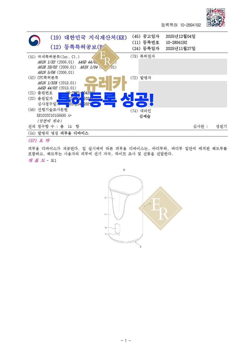 유레카 특허권 출원 사례 '미용·뷰티 디바이스, 피부 관리 장치, 미용 피부 케어, 피부 자극 기술, 화장품 흡수 촉진, 홈케어 뷰티 기기' 특허 등록 성공!