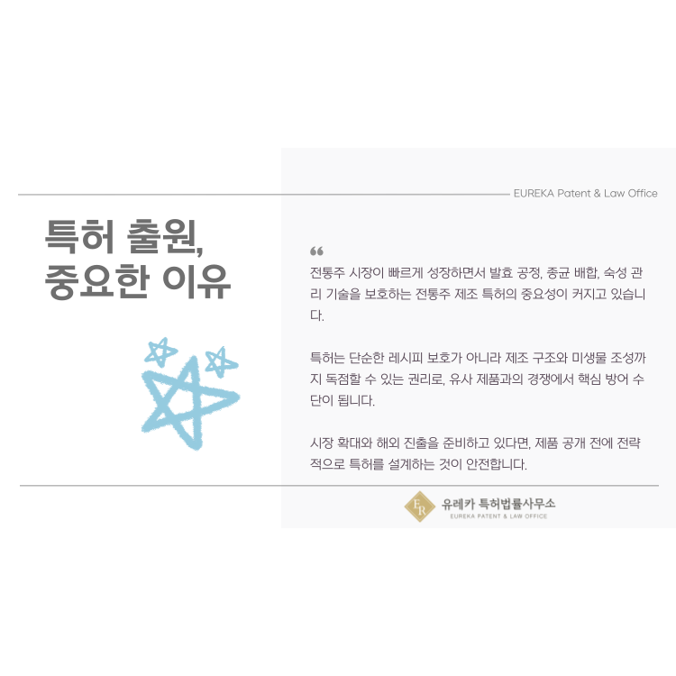 유레카특허법률사무소는 전통주 제조 특허와 발효 공정 관련 기술을 다수 수행해온 경험을 바탕으로,