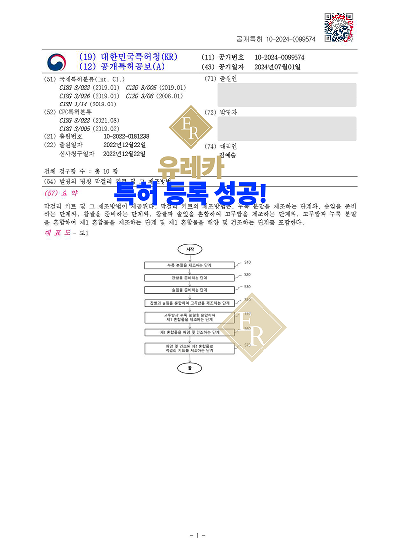 유레카 특허권 출원 사례 '전통주 제조, 발효 공정, 종균 배합, 효모 조성물, 전통주 키트, 숙성 관리 기술' 특허 등록 성공!