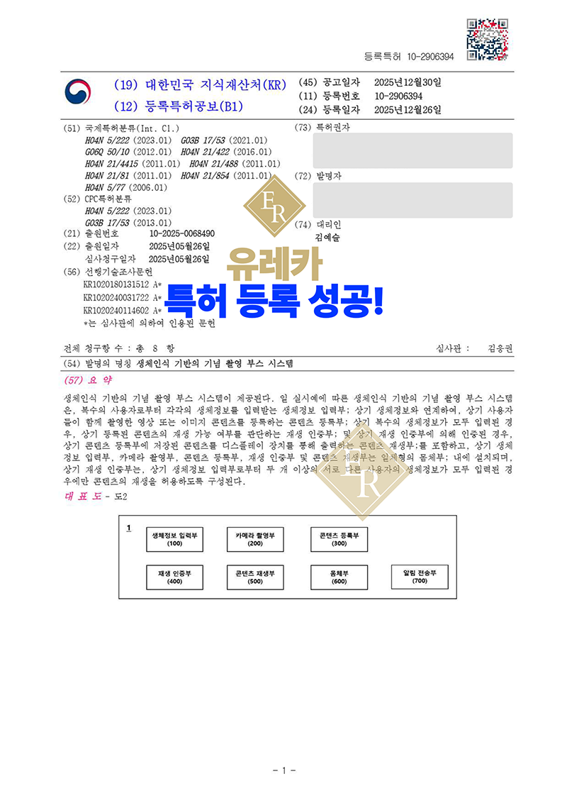 이번에 등록된 본 특허는 생체인식 기술과 AI 촬영 기술이 결합된 차세대 포토 부스 시스템에 관한 것입니다.