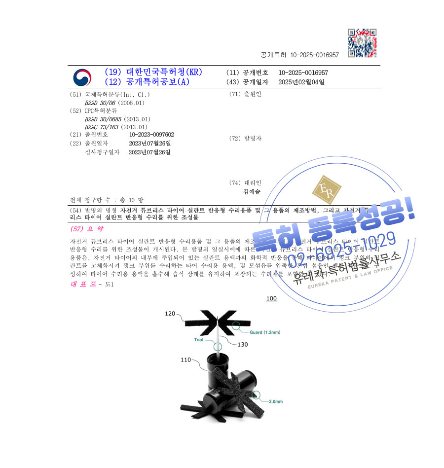 유레카 특허 등록 성공사례 특허출원 “자전거 튜브리스 타이어 실란트반응형 수리용품” 실용신안, 바이크, 경화제, 정비용품, 전기자전거