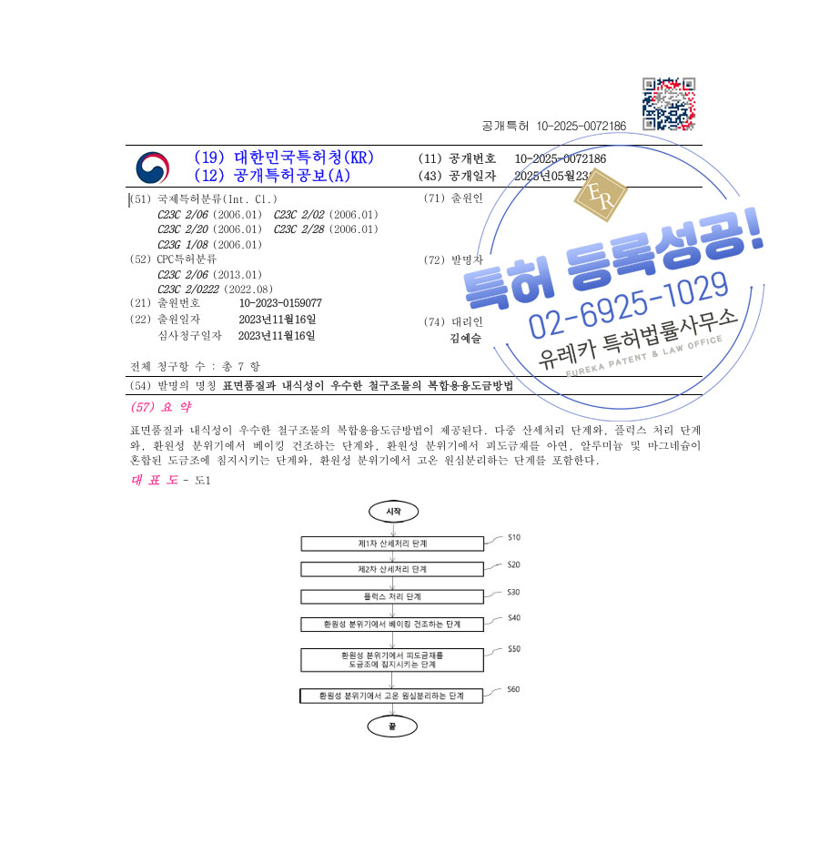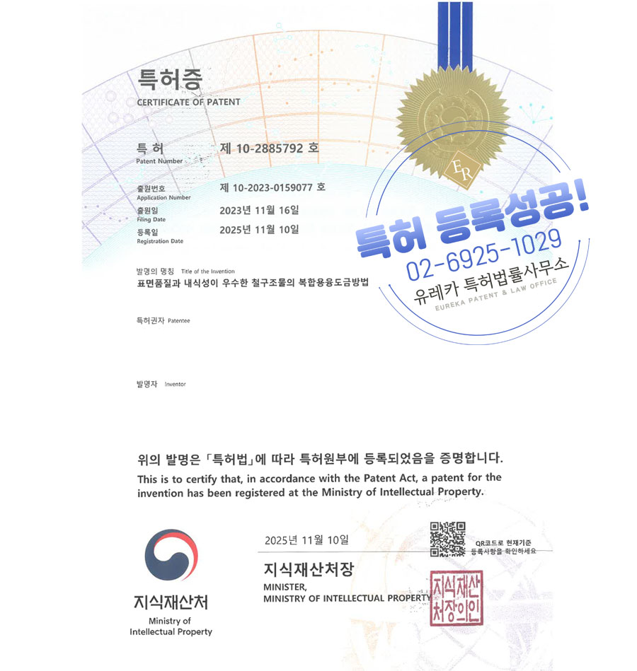 유레카 특허 등록 성공사례 II 건축자재, 산세처리, 용융아연합금 특허 출원 “표면품질과 내식성이 우수한 철구조물의 복합용융도금방법” 특허권 등록
