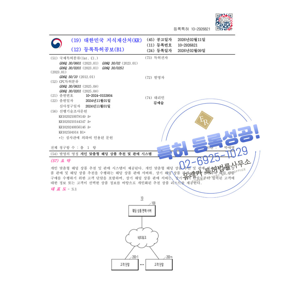 유레카 특허 등록 성공사례 II 결혼정보, 신혼여행, 큐레이션 특허 출원 “개인 맞춤형 웨딩 상품 추천 및 판매 시스템” 특허권 등록