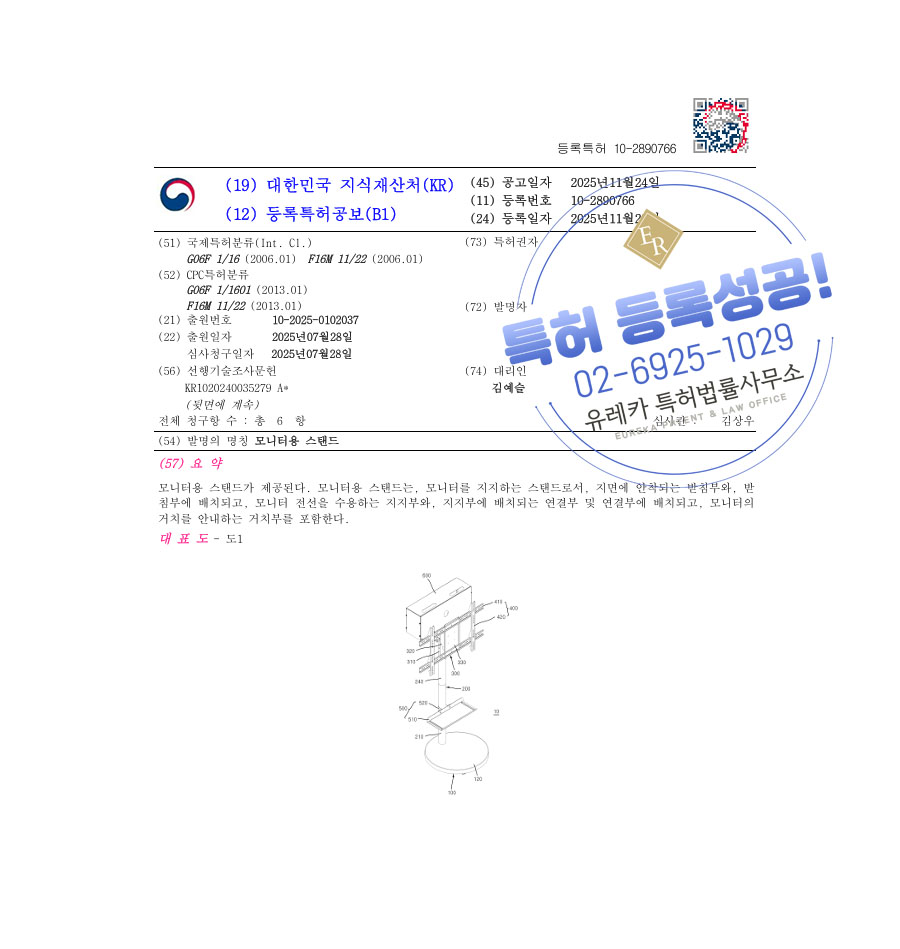 유레카 특허 등록 성공사례 II 노트북 거치대, 지지대, 데스크 장비 특허 출원 “모니터용 스탠드” 특허권 등록