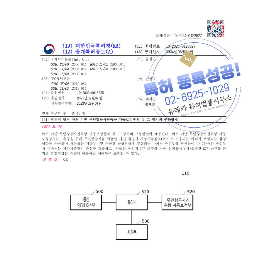 유레카 특허 등록 성공사례 II 드론, GCP, 공공측량 특허 출원 “마커 기반 무인항공사진측량 자동보정장치 및 그 장치의 구동방법” 특허권 등록