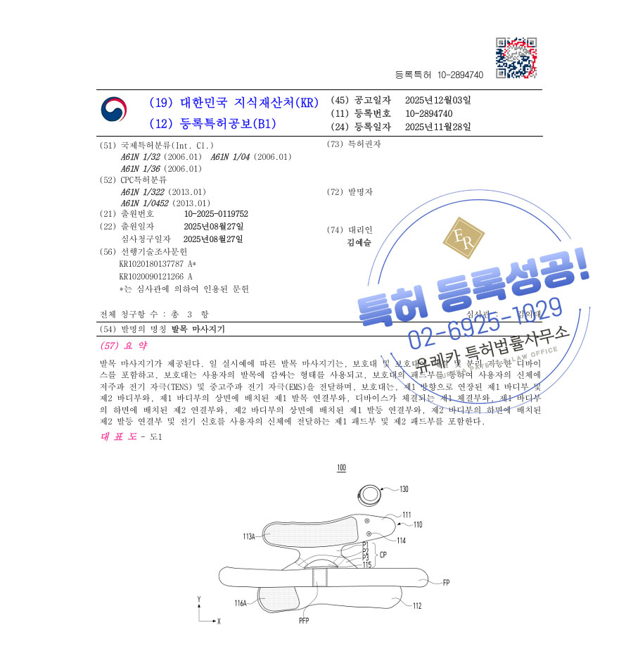 유레카 특허 등록 성공사례 II 물리치료기기, 의료보조기기, 저주파 특허 출원 “발목 마사지기” 특허권 등록
