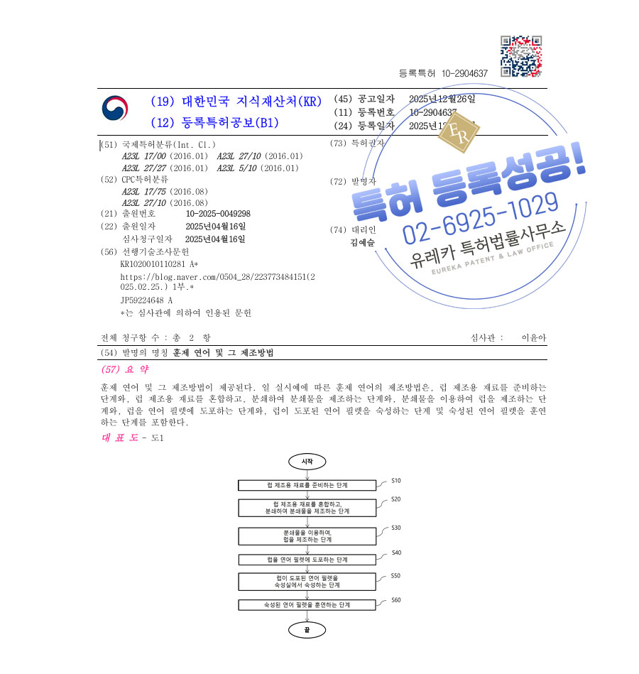 유레카 특허 등록 성공사례 II 생선회, 수산식품, 숯불구이 특허 출원 “훈제 연어 및 그 제조방법” 특허권 등록