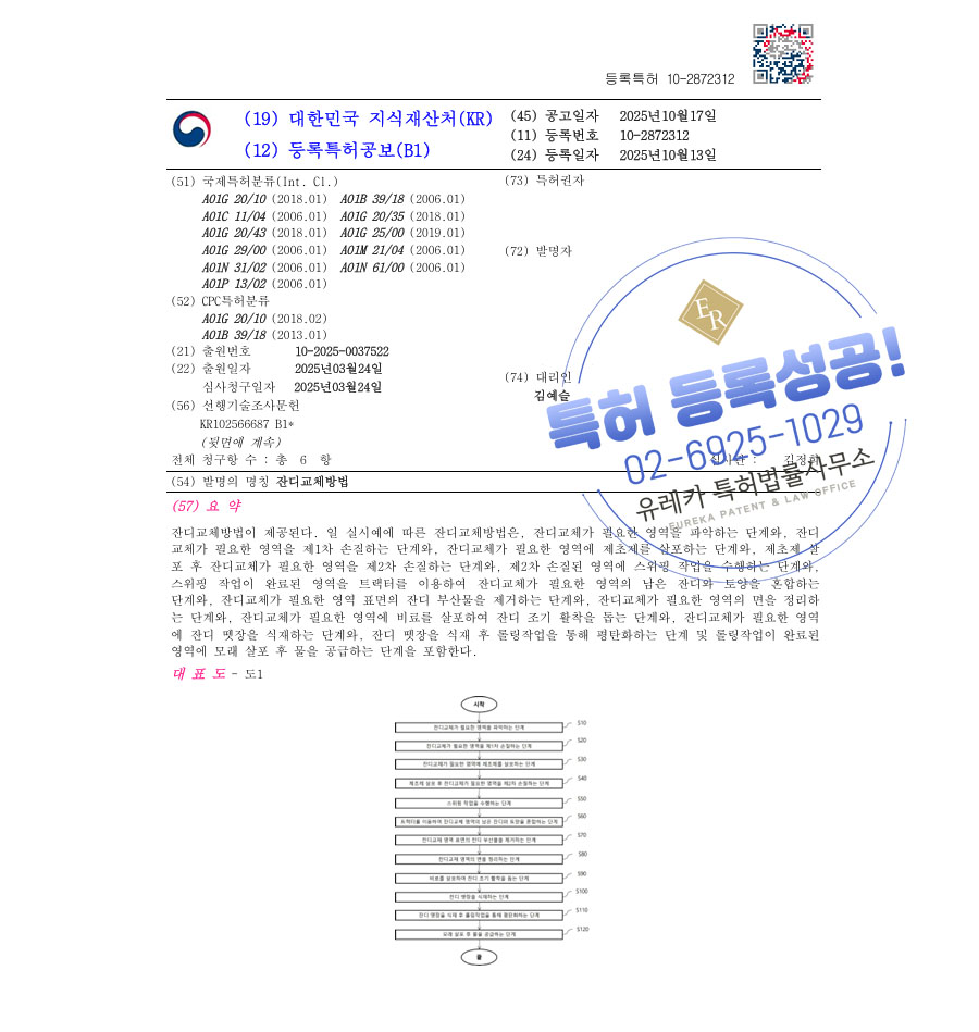 유레카 특허 등록 성공사례 II 식물, 인조잔디, 경기도 특허 출원 “잔디교체방법” 특허권 등록