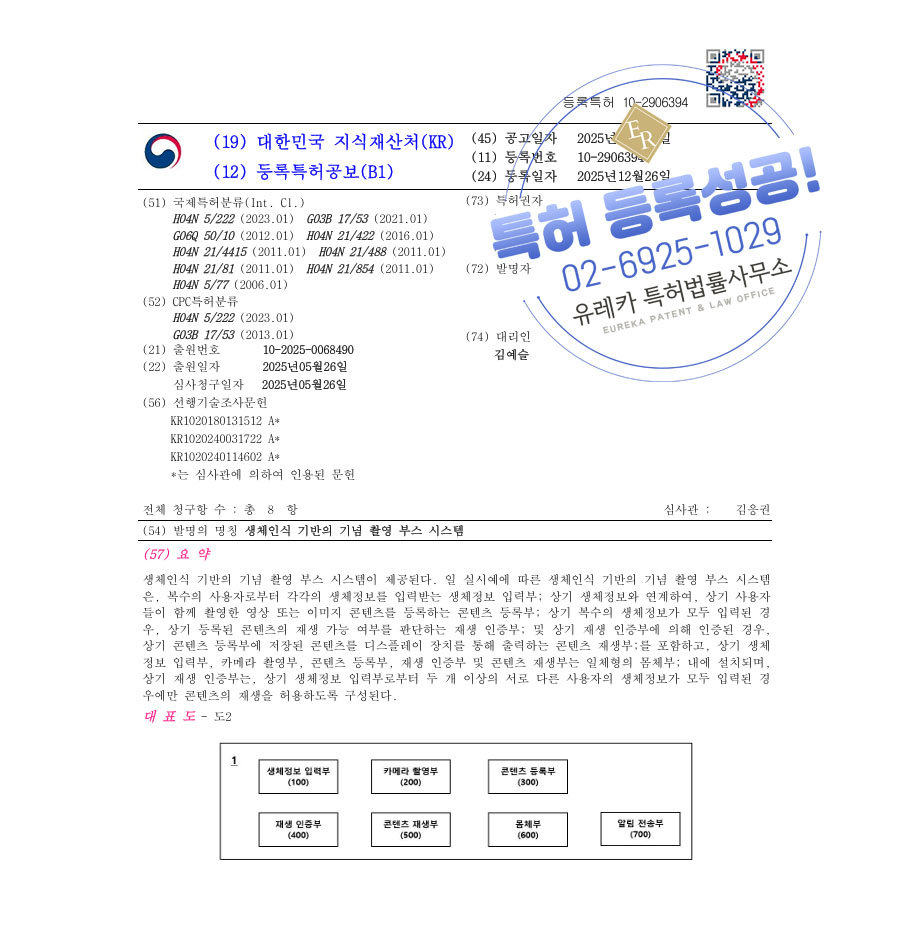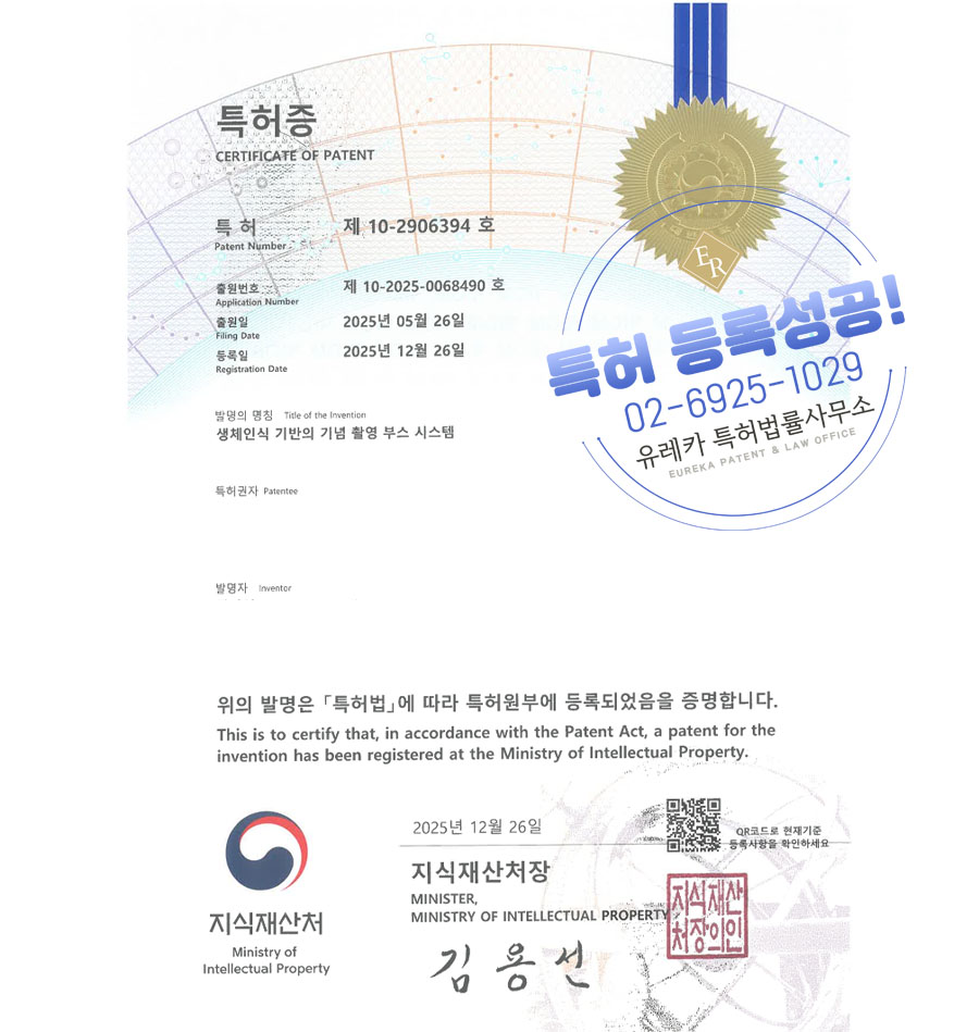 유레카 특허 등록 성공사례 II 안면인식, 생체인증, 셀프사진관 특허 출원 “생체인식 기반의 기념 촬영 부스 시스템” 특허권 등록