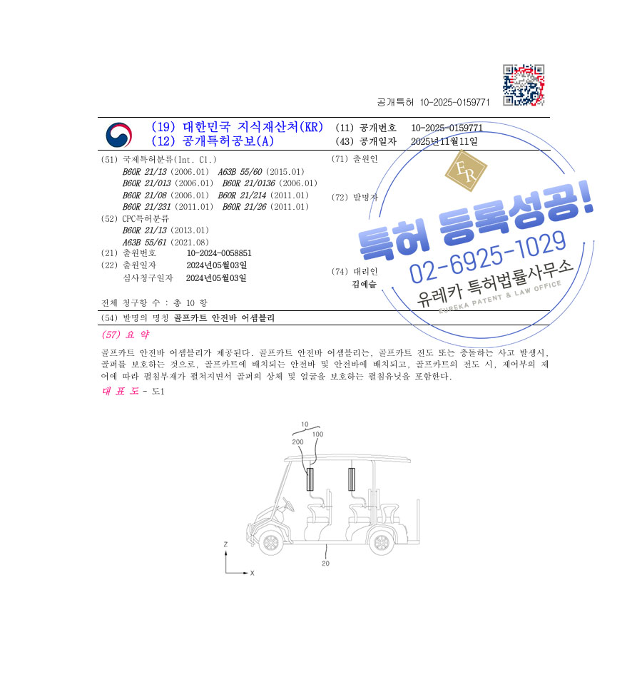 유레카 특허 등록 성공사례 II 안전벨트, 손잡이, 핸드레일 특허 출원 “골프카트 안전바 어셈블리” 특허권 등록