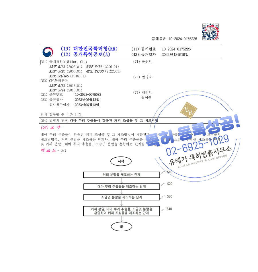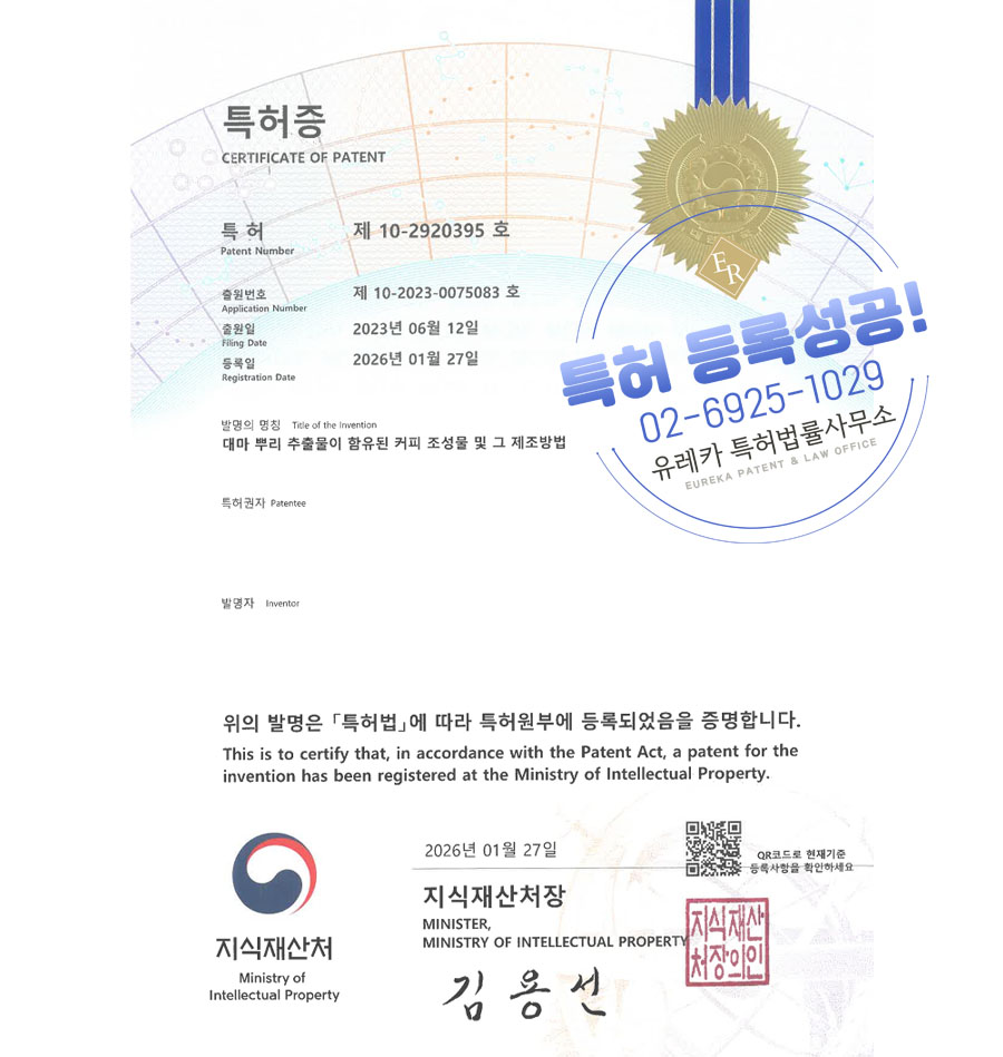 유레카 특허 등록 성공사례 II 카페인, 커피음료, 원두 특허 출원 “대마 뿌리 추출물이 함유된 커피 조성물 및 그 제조방법” 특허권 등록
