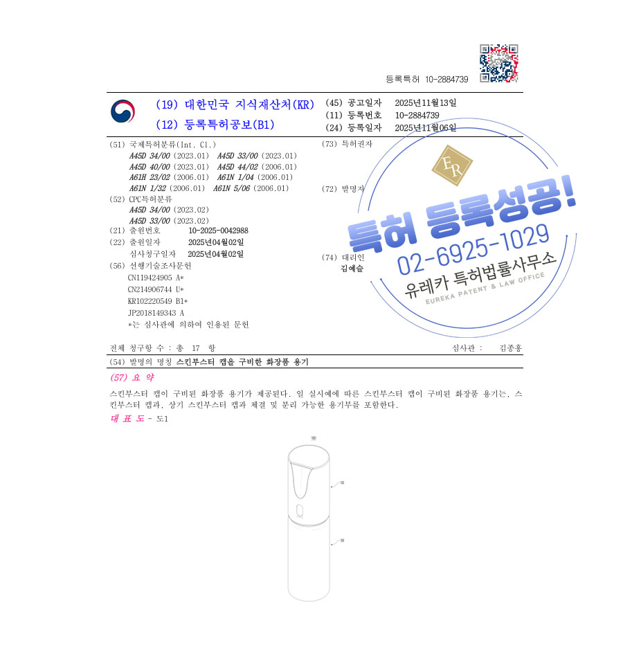 유레카 특허 등록 성공사례 II 피부용 마사지기, 미용 디바이스, 전기 청공 특허 출원 “스킨부스터 캡을 구비한 화장품 용기” 특허권 등록