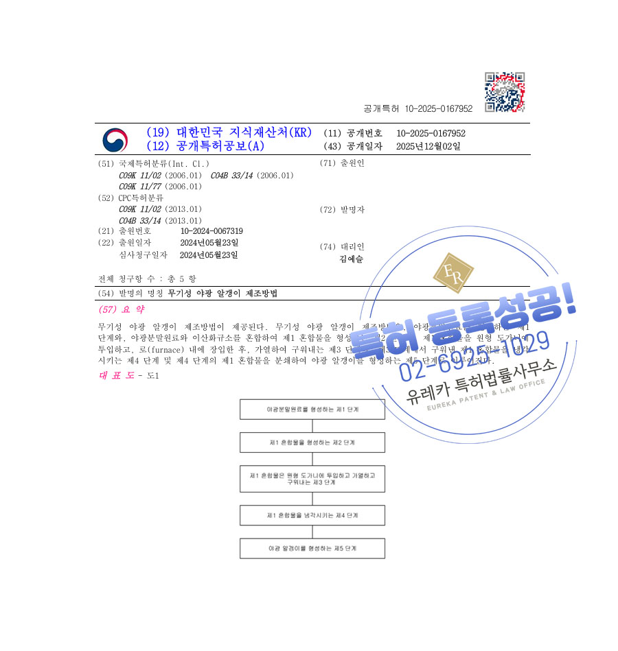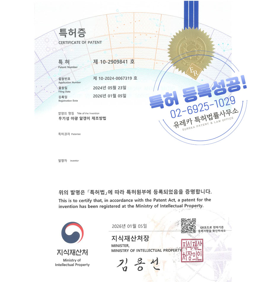 유레카 특허 등록 성공사례 II 형광램프, 도로표지판, 비상구 특허 출원 “무기성 야광 알갱이 제조방법” 특허권 등록