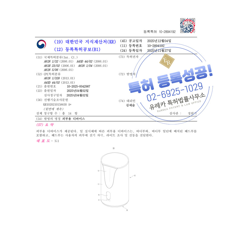 유레카 특허 등록 성공사례 II 화장품용기, 미용기기, 스킨케어 특허 출원 “피부용 디바이스” 특허권 등록