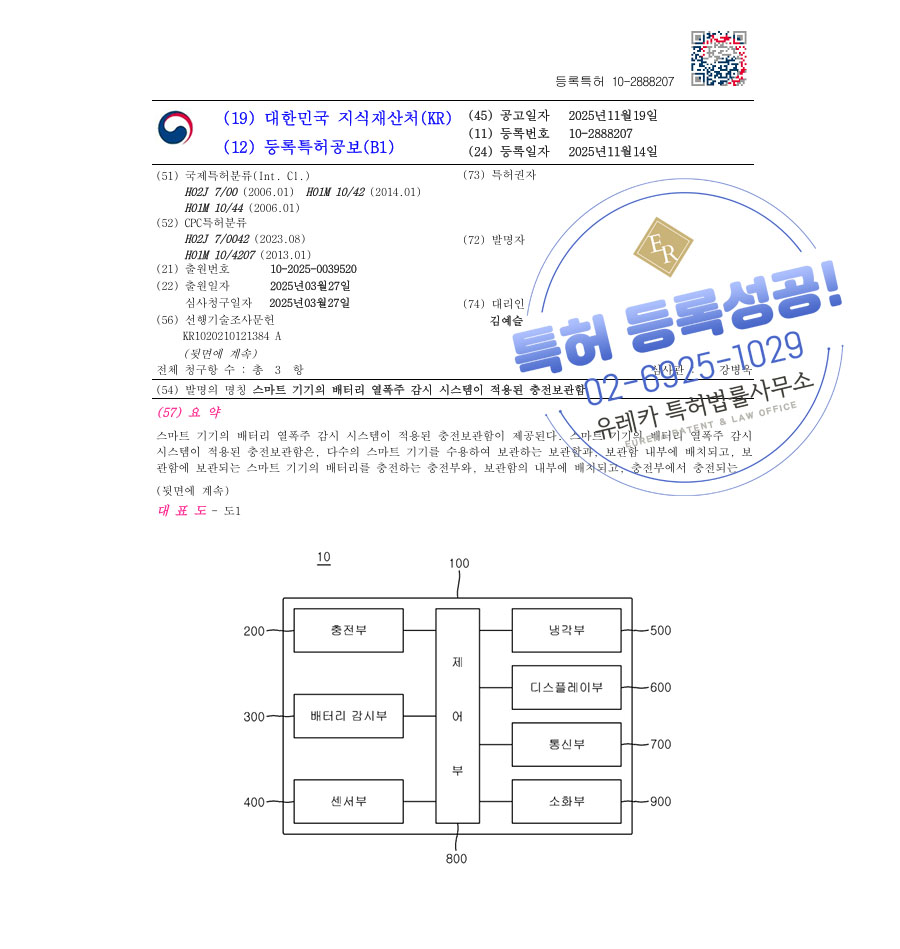 유레카 특허 등록 성공사례 II ARC 시험, 배터리랙, ESS 특허 출원 “스마트 기기의 배터리 열폭주 감시 시스템이 적용된 충전보관함” 특허권 등록