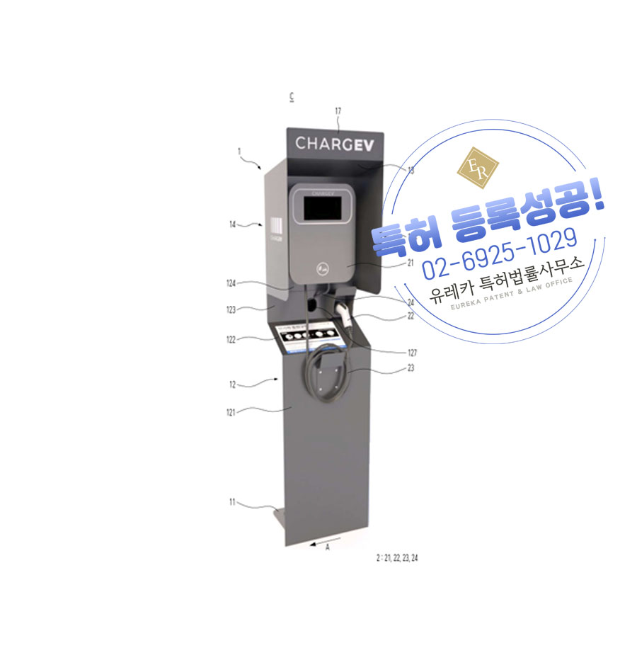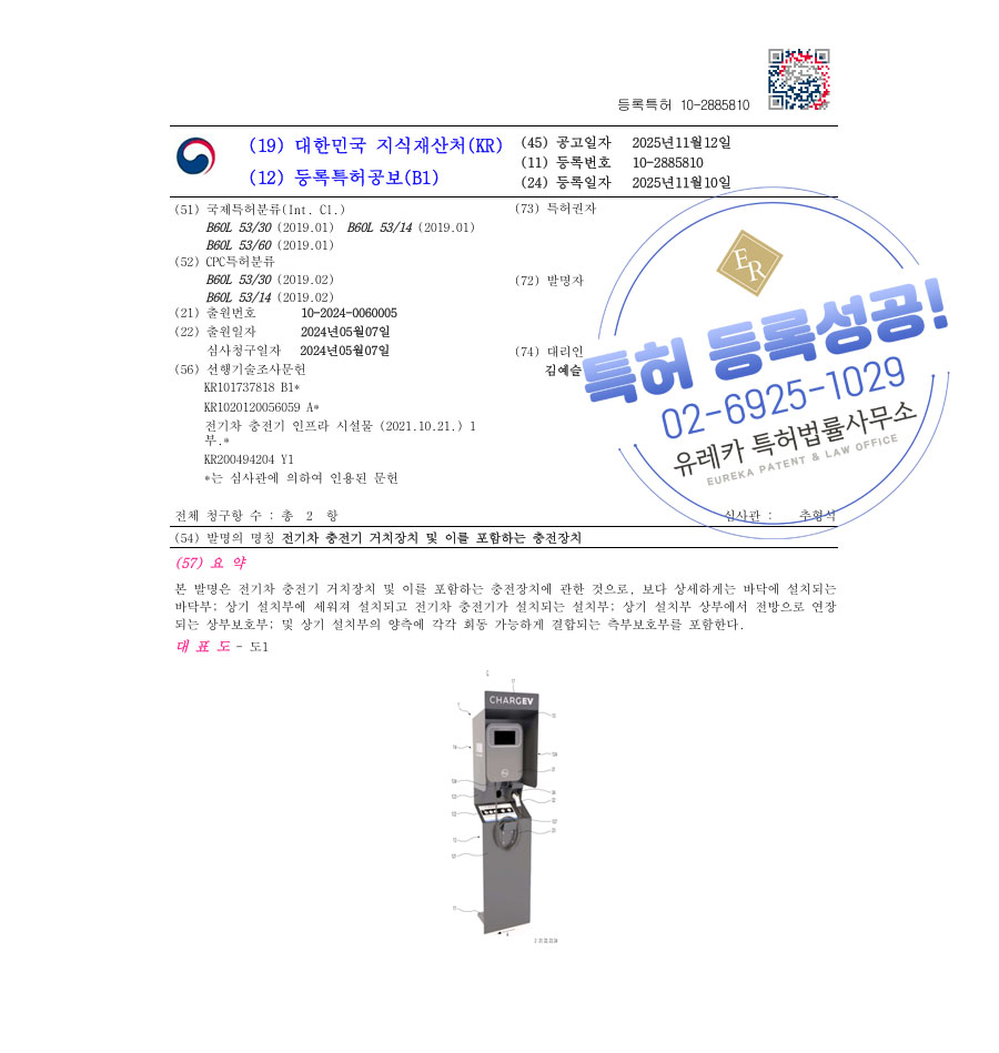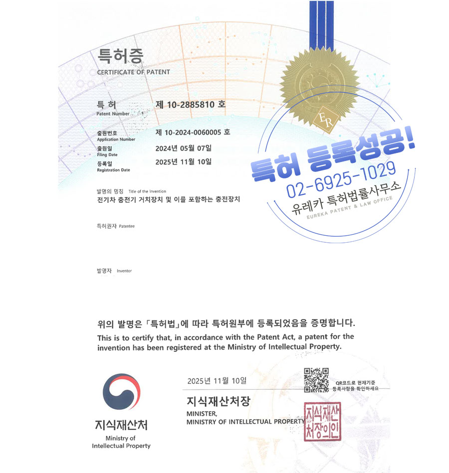 유레카 특허 등록 성공사례 II EV 충전기 스탠드, 스테이션, 오산 특허 출원 “전기차 충전기 거치장치 및 이를 포함하는 충전장치” 특허권 등록