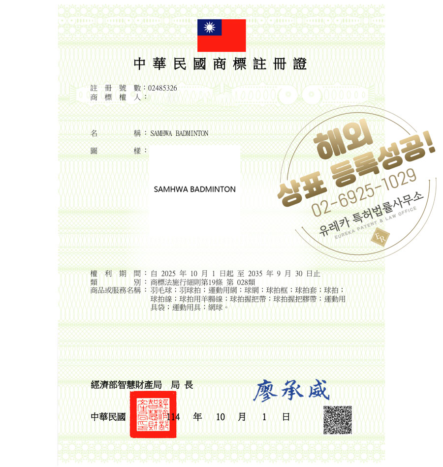 유레카 해외등록 성공! 대만 상표 출원 “SAMHWA BADMINTON” 대만 스포츠, 타이완, 배드민턴 브랜드 절차, 방법, 심사, 상표권 특허 등록
