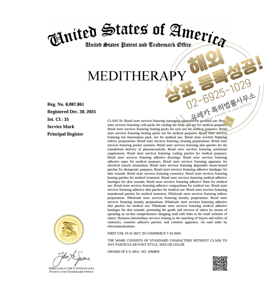 유레카 해외등록 성공! 미국 상표 출원 “MEDITHERAPY” 미국마사지기, 아마존상표, 미국화장품, 부스터 절차, 방법, 심사, 상표권 특허 등록