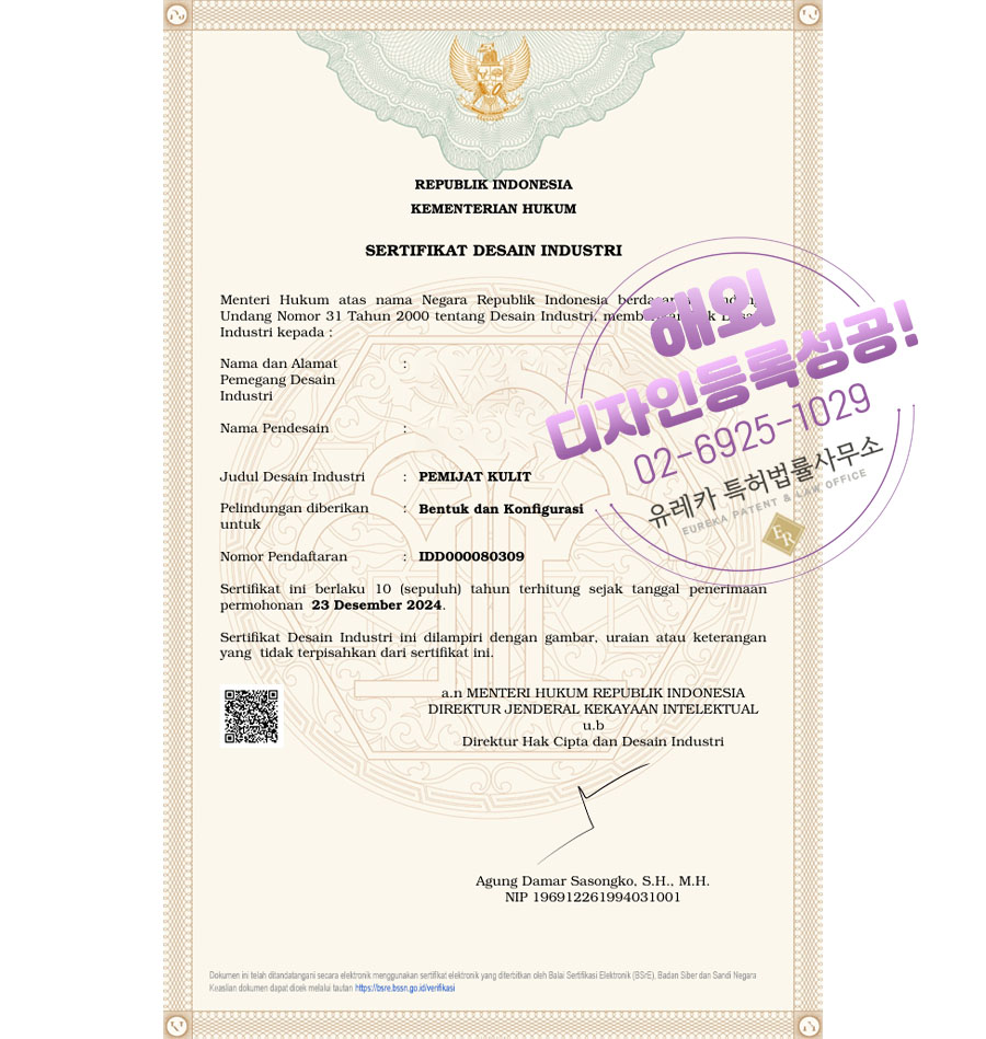 유레카 해외등록 성공! 인도네시아 디자인 특허 “피부마사지기” 중동, 동남아, 아시아, K뷰티 디자인 특허 절차, 방법, 심사, 디자인권 출원 등록