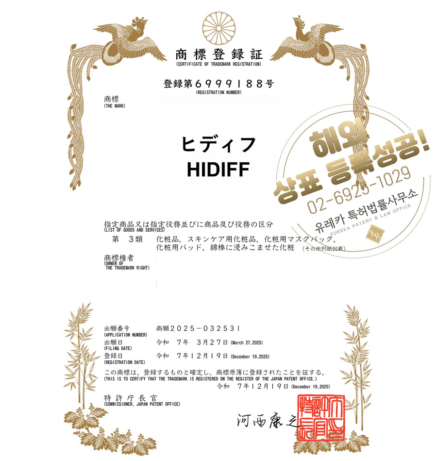 유레카 해외등록 성공! 일본 상표 출원 “ヒディフ/HIDIFF” 일본 상표권 신청, 마스크팩, EMS디바이스, 크림, K브랜드 상표 특허 등록 절차, 방법, 심사