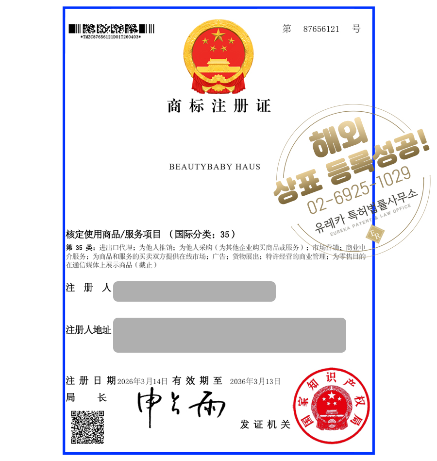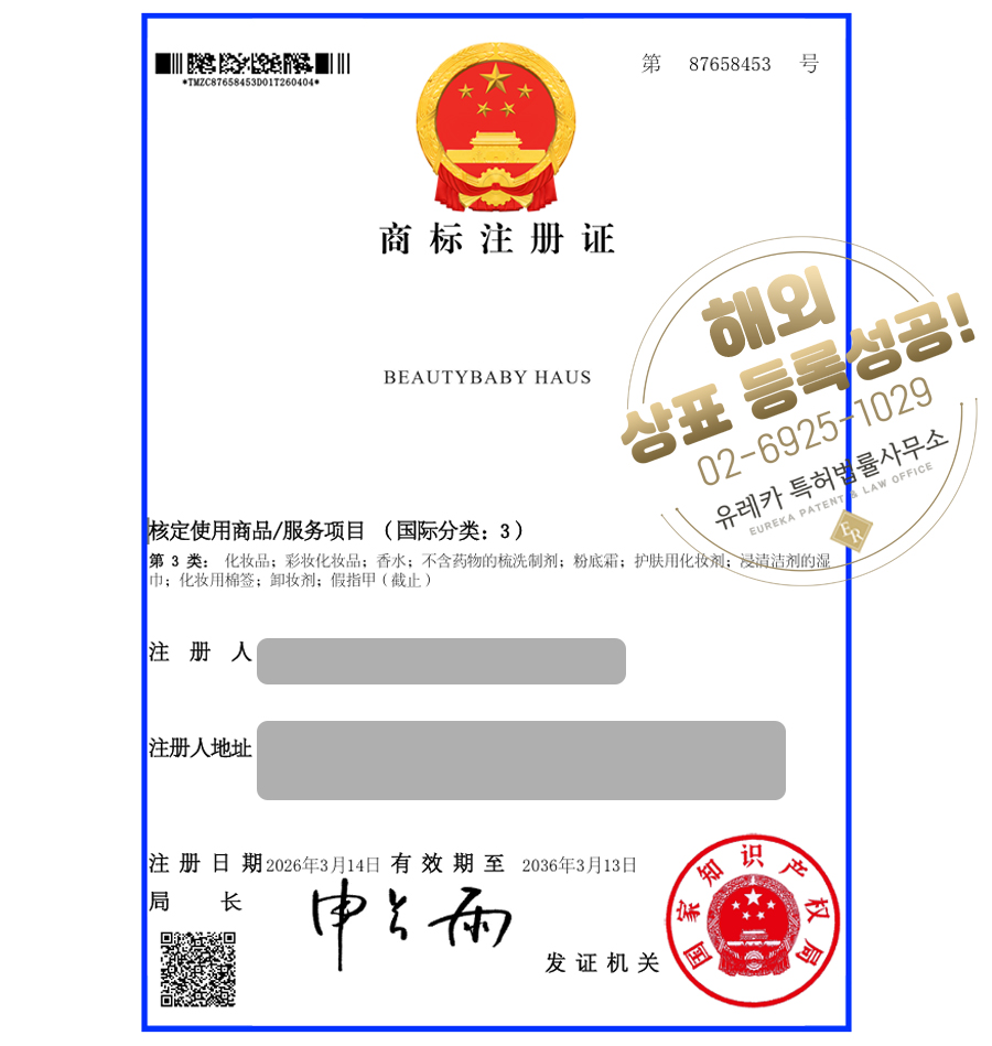 상표심사를 통과하여, 최종적으로 중국 등 상표등록에 성공하였습니다!