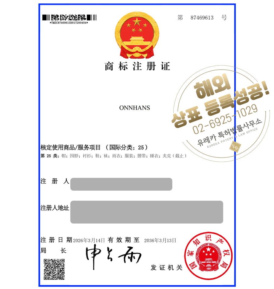 상표심사를 통과하여, 최종적으로 중국 등 상표등록에 성공하였습니다!