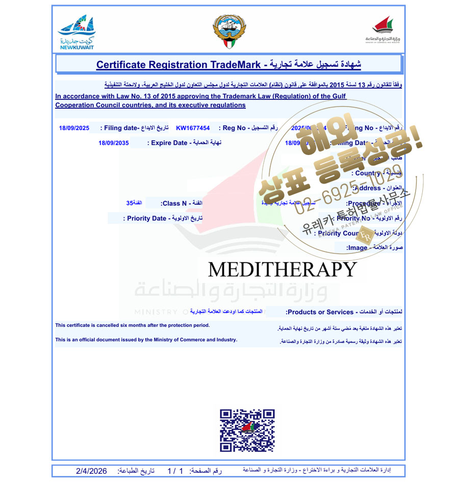 유레카 해외등록 성공! 쿠웨이트 상표 출원 “MEDITHERAPY” 아랍, 중동, 걸프국가, GCC 상표권 특허 등록 절차, 방법, 심사