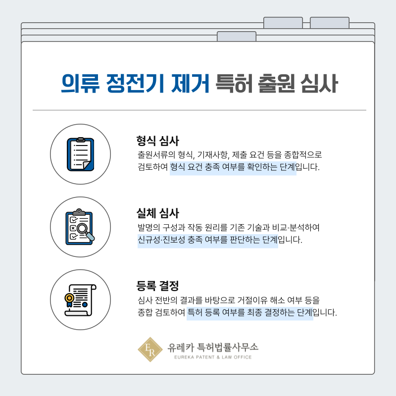 정전기 제거 기술의 경우 신규성, 진보성, 산업적 이용 가능성을 중심으로 심사가 이루어집니다.