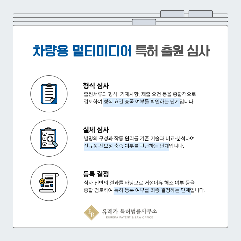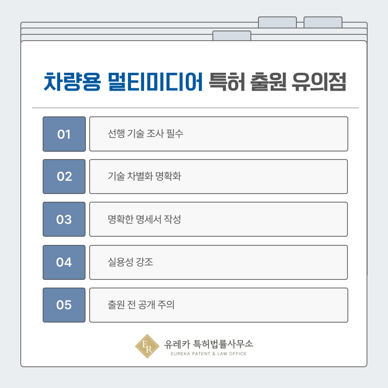 또한 차량용 멀티미디어 기술은 발전 속도가 빠르기 때문에 아이디어가 정리되었다면 빠르게 출원하는 것이 매우 중요합니다.