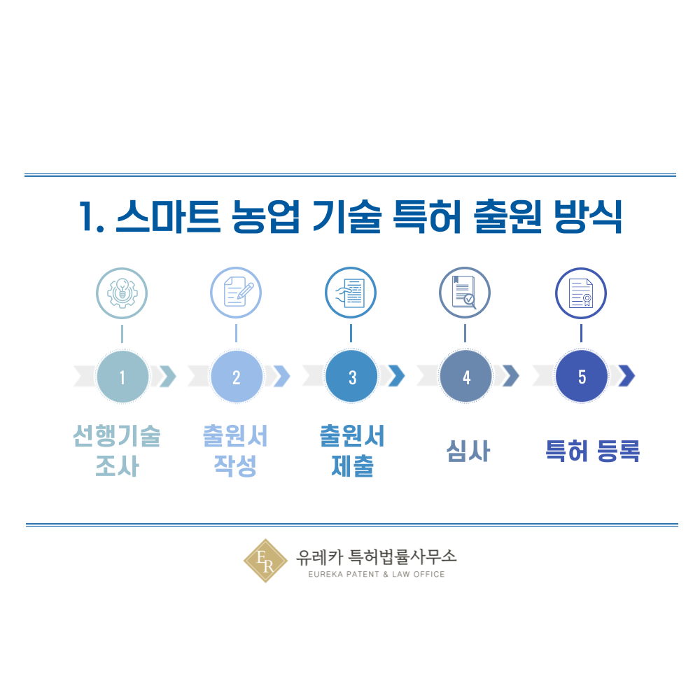 1. 스마트 농업 기술, 작물 재배 생산 기술, 정식, 파종 장치, 토양개량제, 관수/관비 시스템 특허 출원 방식