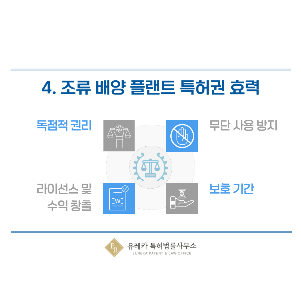 특허권은 제3자가 권리자의 동의 없이 발명을 제조, 판매, 수입하거나 사용하는 것을 금지합니다. 만약 경쟁사가 조류 배양 플랜트 기술을 무단으로 이용한다면, 특허권자는 침해금지 청구나 손해배상 청구를 통해 법적으로 대응할 수 있습니다. 이를 통해 불공정 경쟁을 예방하고, 권리자의 연구 성과와 경제적 이익을 확실히 지킬 수 있습니다. 특허권은 권리자가 기술을 마음 놓고 활용할 수 있는 안정성을 제공합니다.