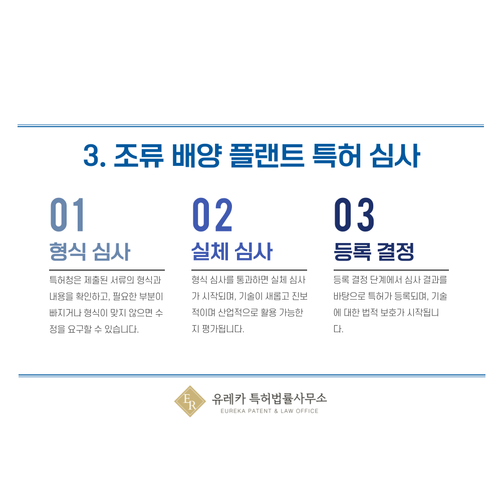 조류 배양 플랜트 특허를 출원하면 가장 먼저 형식심사가 진행됩니다. 이 단계에서는 제출된 서류가 법에서 정한 형식 요건을 제대로 충족하는지 검토합니다. 발명의 명칭, 출원인과 발명자 정보, 명세서와 청구항, 도면 등이 빠짐없이 갖추어져 있어야 하며, 누락이나 오류가 있으면 보정 요구가 내려집니다. 형식심사를 통과해야 본격적인 기술 심사로 넘어갈 수 있습니다.