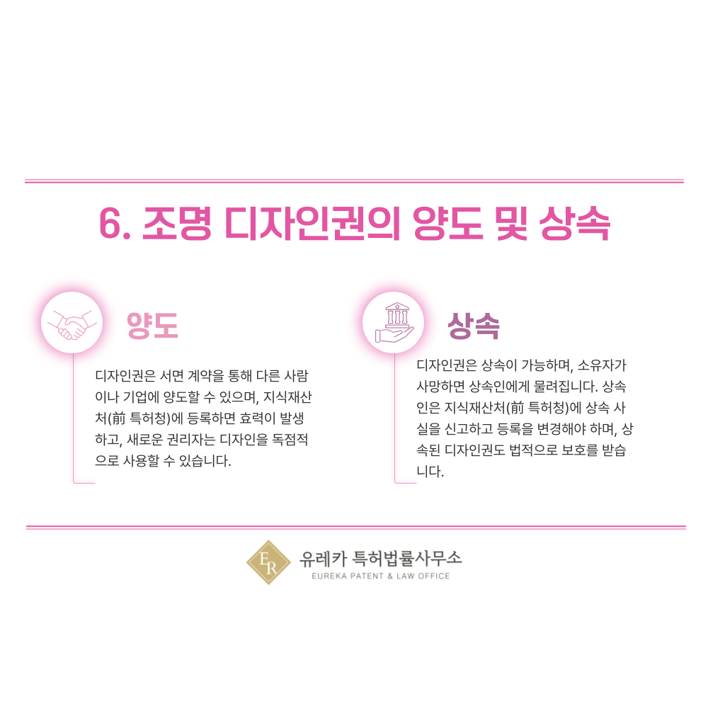 즉, 조명 디자인권은 단순한 창작물이 아닌, 세대를 이어 지속적으로 가치가 유지되는 법적 재산으로 보호됩니다.