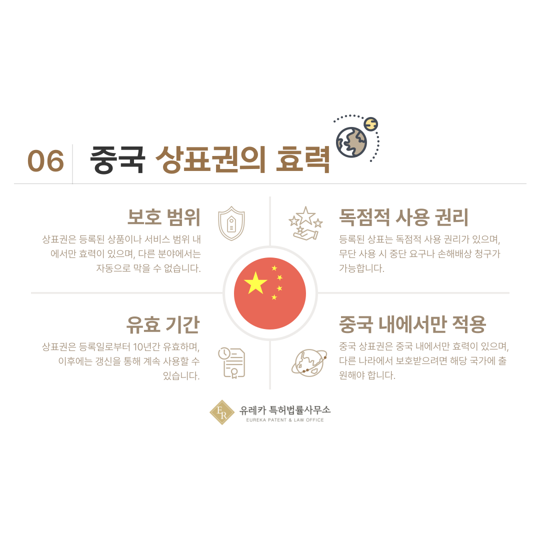 중국 상표권의 효력은 중국 내에서만 적용되며, 다른 국가나 지역에는 자동으로 확장되지 않습니다.