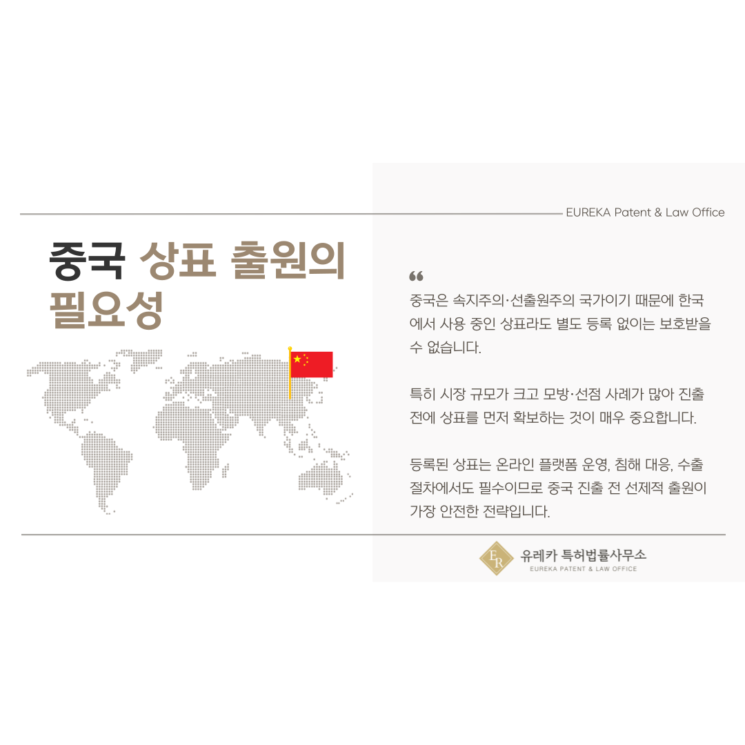 특히 중국은 시장 규모가 크고 온라인 유통이 활발해 상표가 노출되는 순간 모방이나 선점 사례가 빠르게 발생할 수 있습니다.