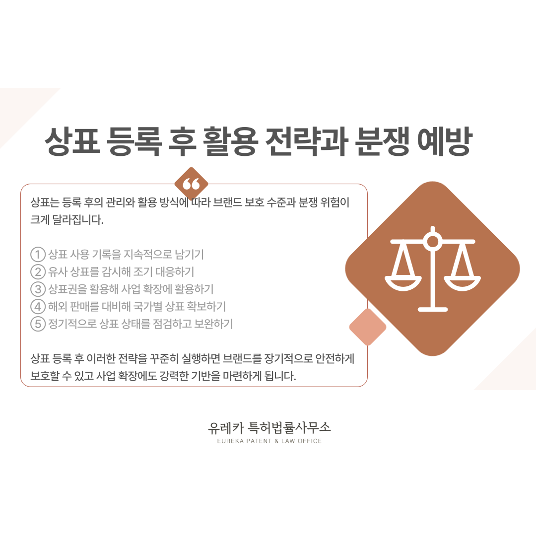 아래 내용은 상표 등록 후 꼭 알아야 할 활용 전략과 분쟁 예방 방법을 간단하지만 충분히 이해되도록 정리한 것입니다.