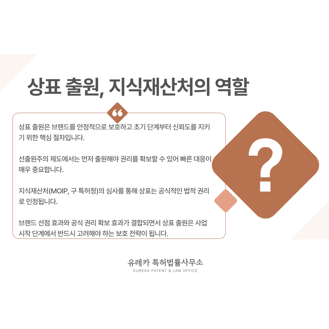 이 두 요소가 함께 작용해 상표 출원은 브랜드 구축 단계에서 가장 우선적으로 고려해야 하는 보호 전략이 됩니다.