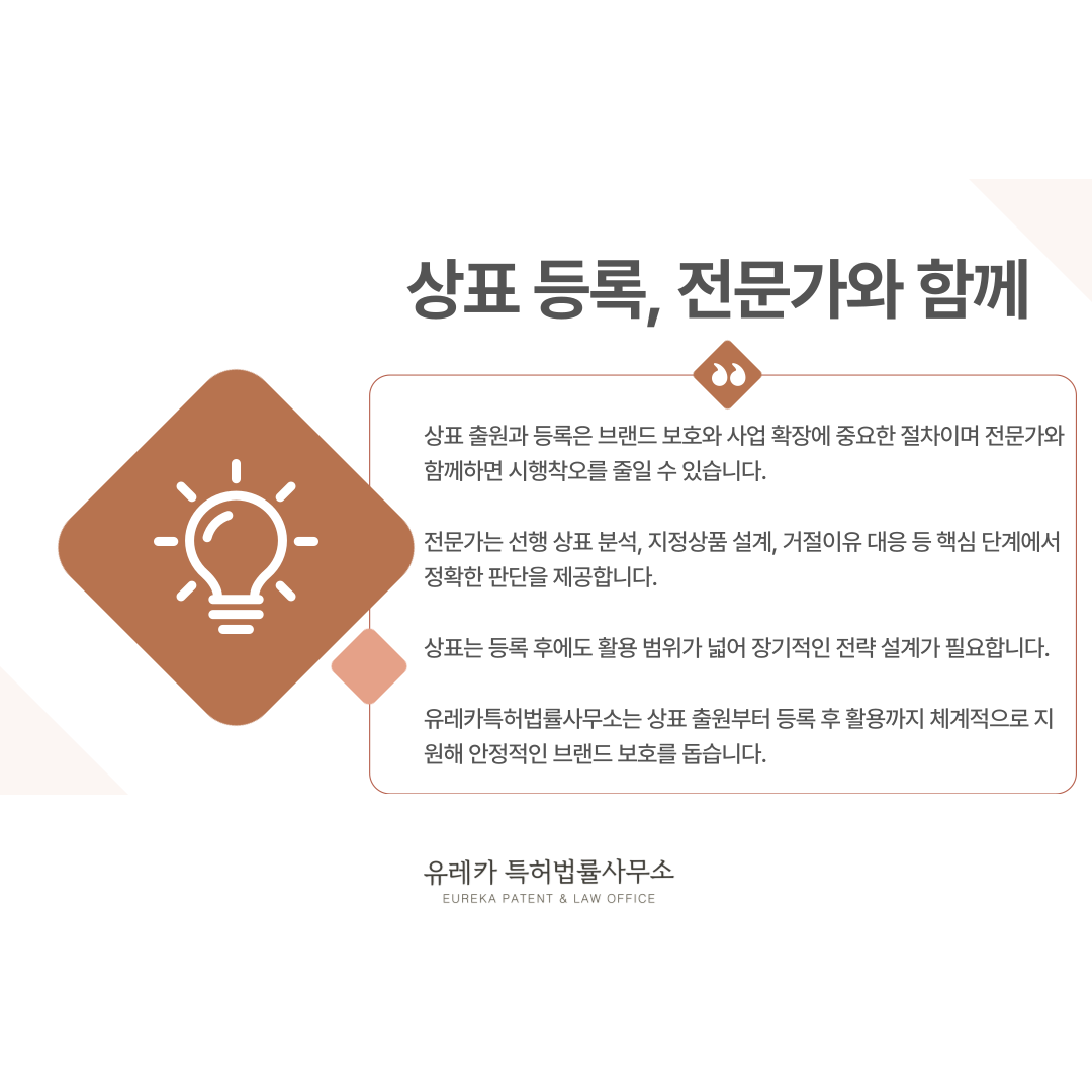 유레카특허법률사무소는 상표 출원부터 등록 후 활용까지 전 과정을 편안하고 체계적으로 안내하며
