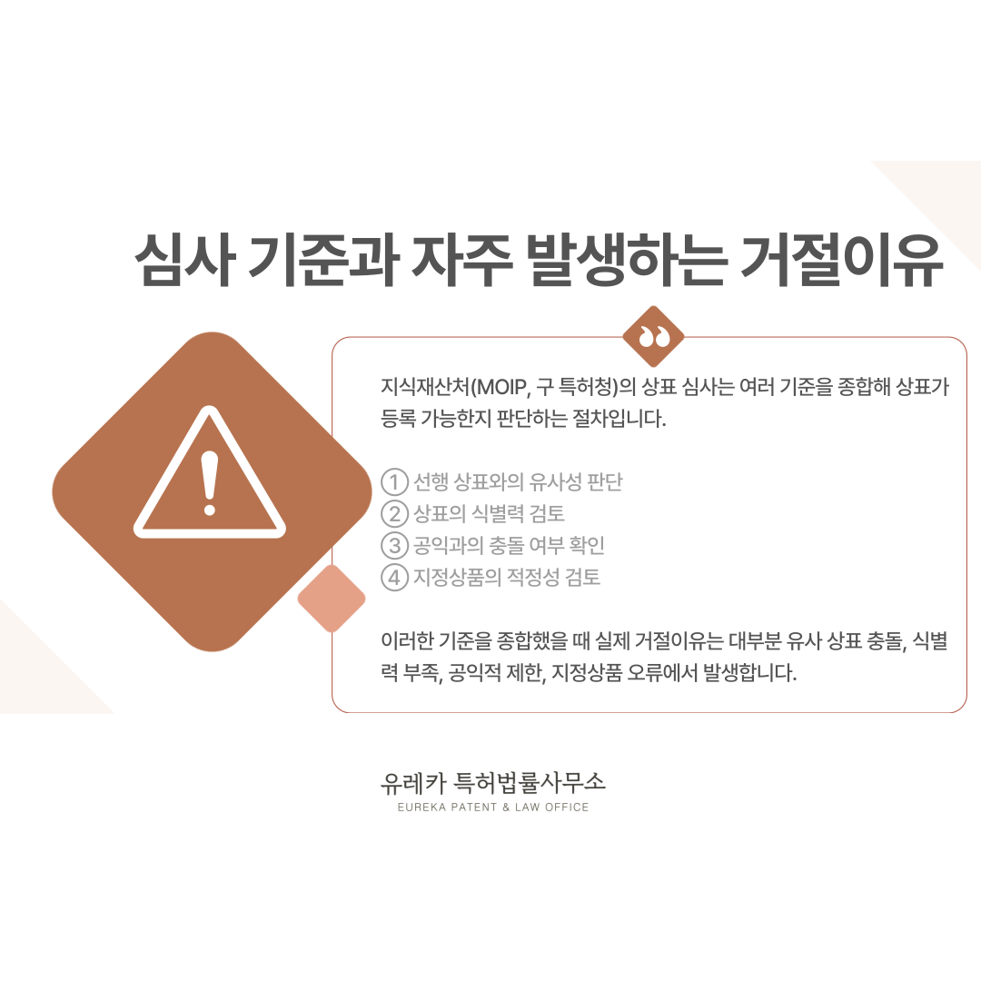 이러한 기준을 종합했을 때 실제 거절이유는 대부분 유사 상표 충돌, 식별력 부족, 공익적 제한, 지정상품 오류에서 발생합니다.