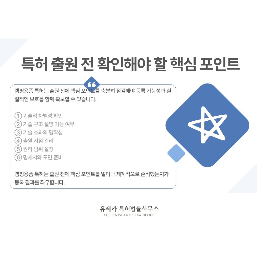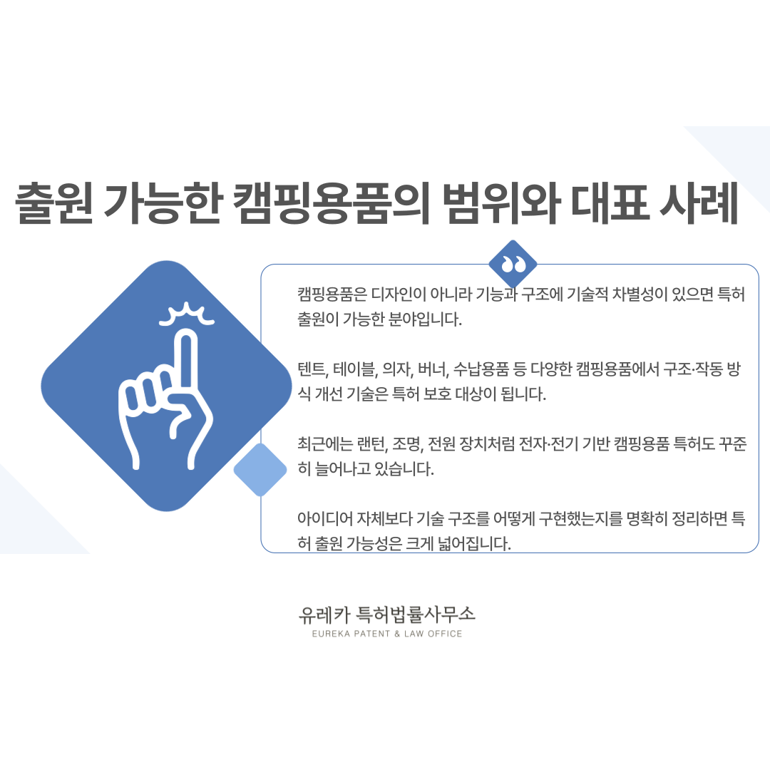 기술적 차별 포인트를 정확하게 정리하면 캠핑용품 특허 출원 가능성은 생각보다 훨씬 넓습니다.