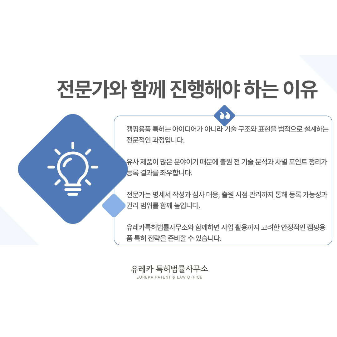 캠핑용품 분야는 이미 유사 제품이 많아 특허 준비가 쉽지 않은 영역입니다.