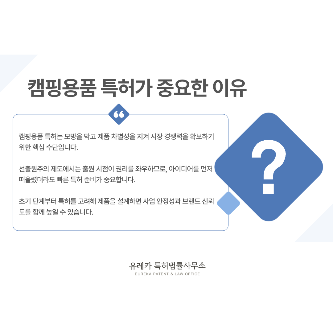 결과적으로 캠핑용품 특허는 권리 보호를 넘어 사업 안정성과 시장 경쟁력을 동시에 확보하는 전략적 선택이라고 볼 수 있습니다.