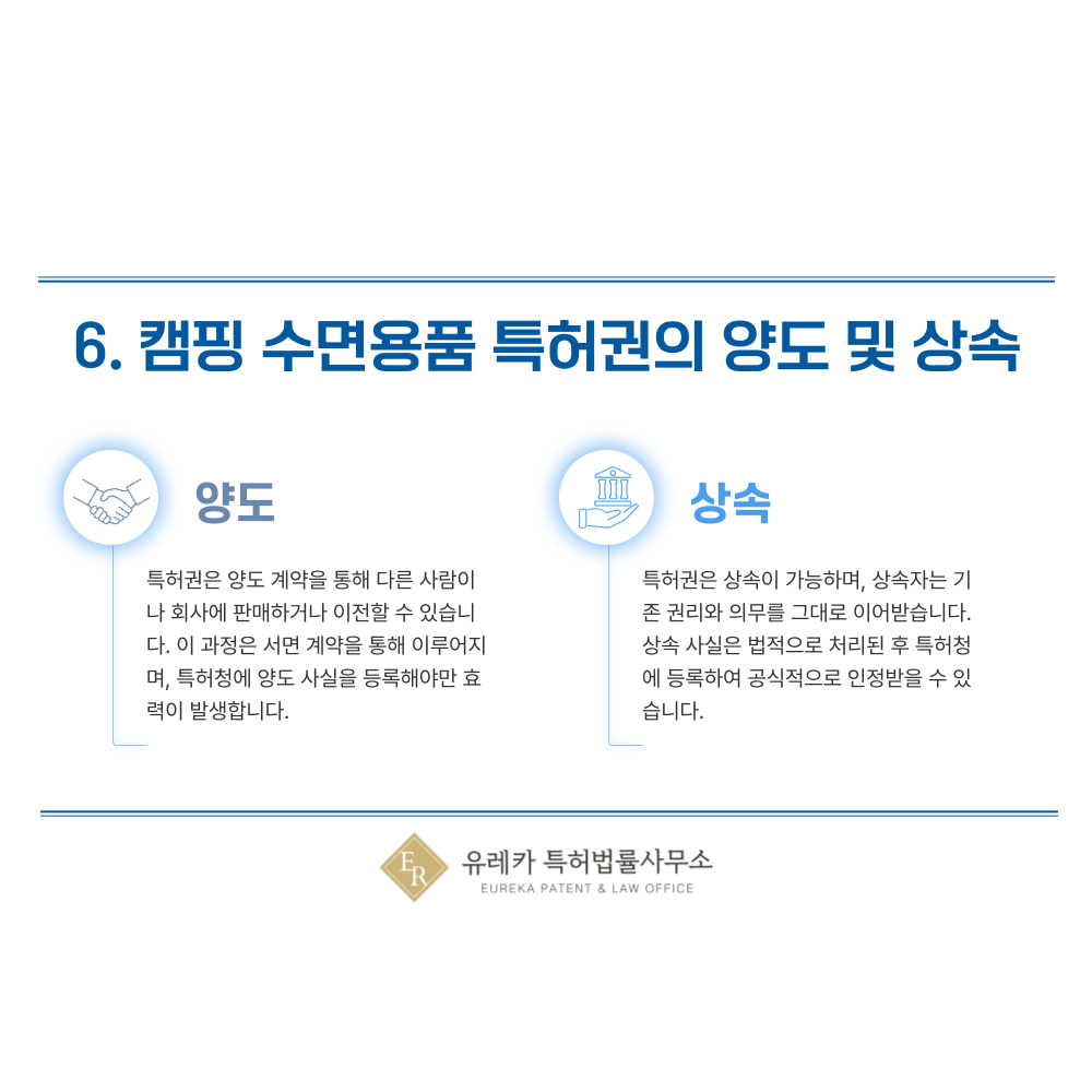 6. 캠핑 수면용품, 캠핑용 침구, 침낭, 린터, 매트, 코트, 야전침대 특허권의 양도 및 상속