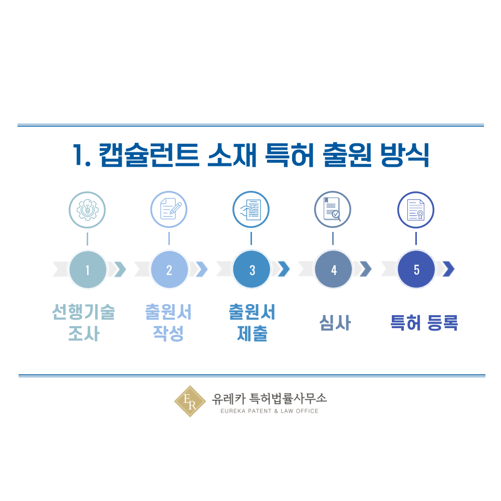 캡슐런트 소재가 특허로 등록되려면 기존에 알려진 기술과 뚜렷하게 구별되어야 합니다. 이를 확인하기 위해 국내외 특허 데이터베이스, 학술 논문, 기존 제품 자료 등을 폭넓게 조사하는 과정을 거칩니다. 이렇게 선행기술을 조사하면 내 발명의 차별성을 찾을 수 있고, 등록 가능성을 높이는 전략을 세울 수 있습니다. 또한 이 단계는 불필요한 거절 가능성을 줄여주고, 명세서 작성 방향을 구체화하는 데 중요한 역할을 합니다.
