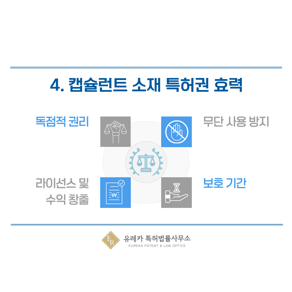 캡슐런트 소재가 특허로 등록되면 발명자는 그 기술을 독점적으로 사용할 수 있는 권리를 얻게 됩니다. 이는 동일하거나 유사한 소재나 제조 방법을 다른 사람이 임의로 활용하지 못하도록 보장하는 강력한 권리입니다. 덕분에 발명자는 자신의 연구개발 성과를 안정적으로 지키고, 시장에서 기술적 우위를 확보할 수 있습니다.